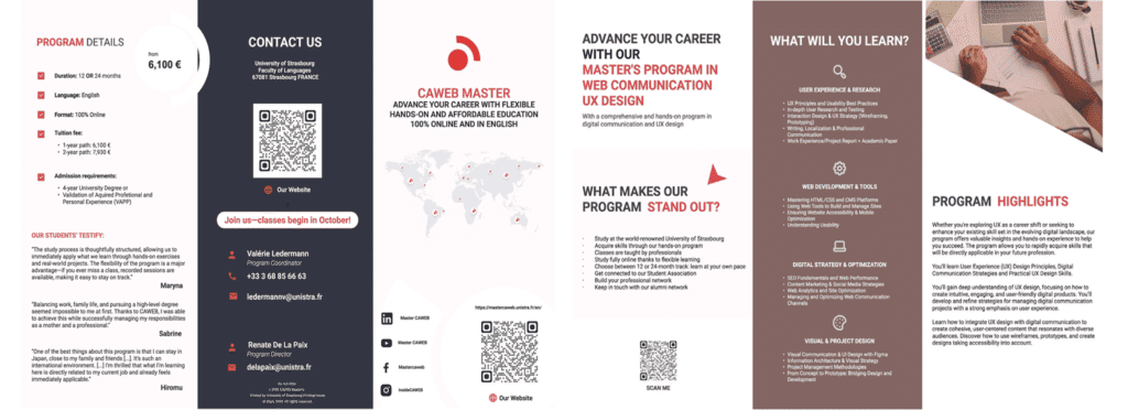 Démarche : réalisation d’une brochure d’information afin de promouvoir le master CAWEB auprès de futurs étudiants (promotion 2025-2026). L’objectif est d’attirer de nouveaux candidats en présentant le atouts de la formation. La brochure a été réalisée sur Figma, selon une toute nouvelle charte graphique codéfinie entre étudiants (moderne, professionnelle, dynamique).
